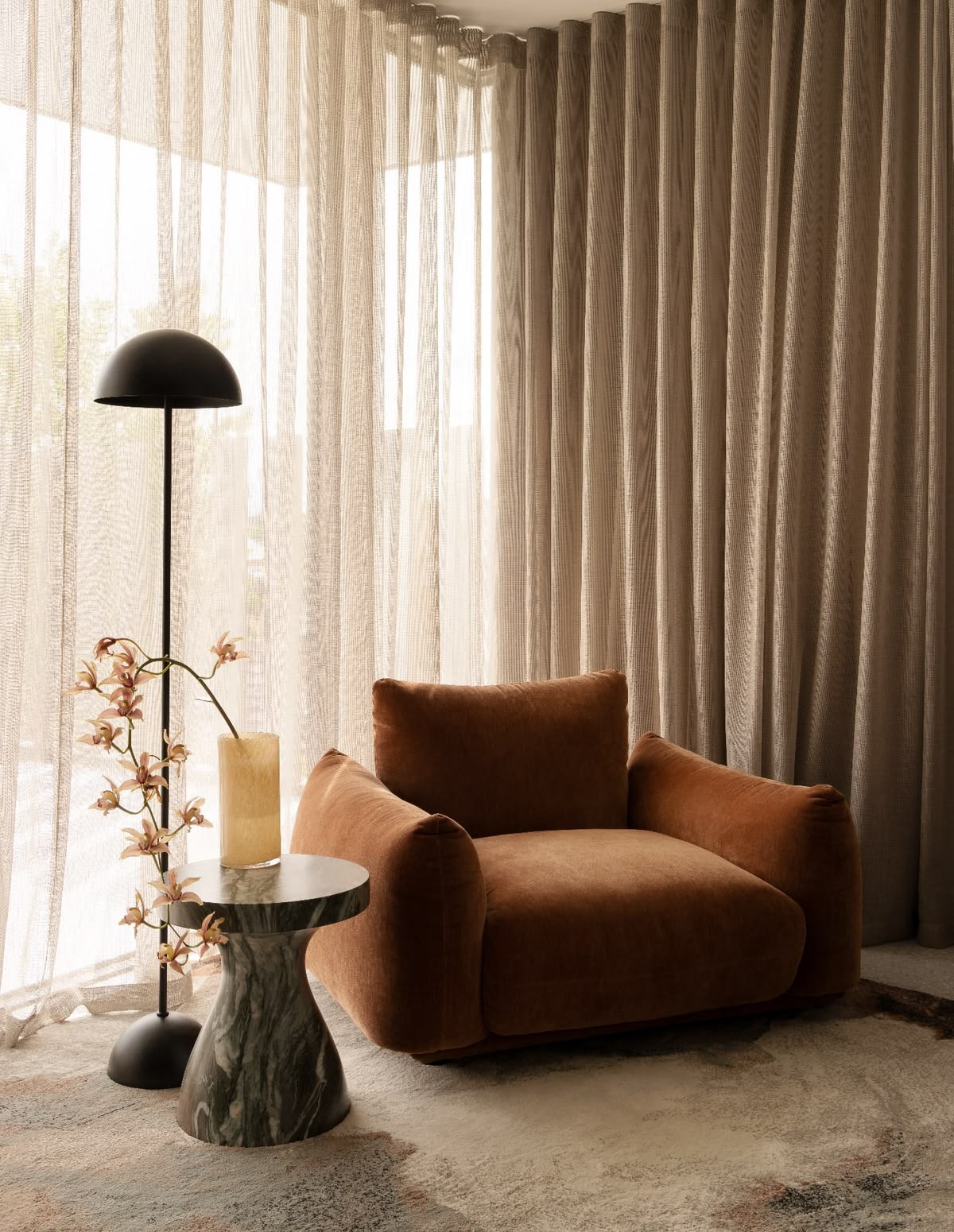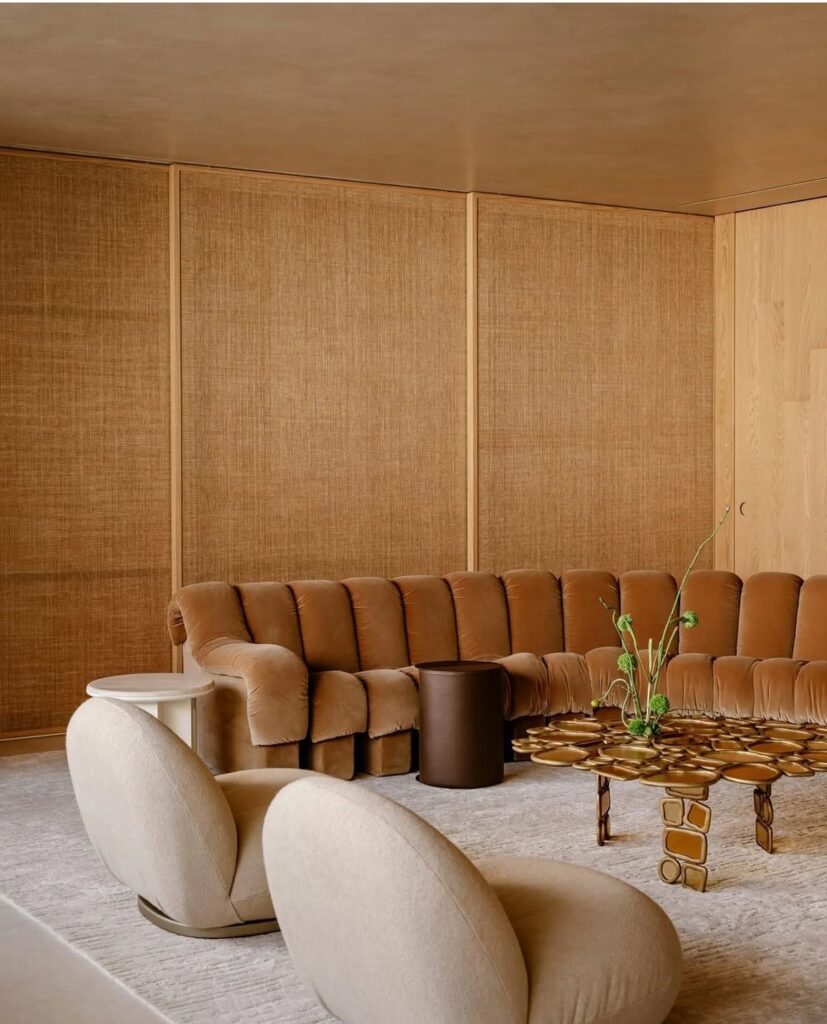 These substantial chairs often feature deep seats, plush cushioning, and soft, tactile upholsteries, like luxurious fabrics or even a rich boucle. They blur the line between accent chair and lounge seat, turning functional seating into something that feels warm, inviting, and honestly, a little indulgent. This scale encourages slower living and deeper relaxation; a sign of how much our relationship with home has evolved. It signals that a room is meant to be lived om, not just looked at. These bold shapes, often rounded, sculptural or cloud-like, add visual rhythms and luxury, giving spaces personality even before adding accessories.